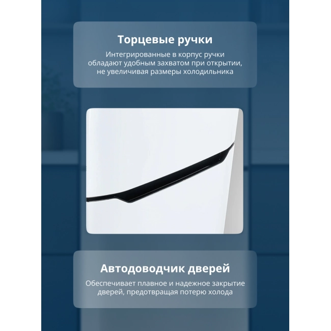 Особая интегрированная форма дверных ручек подчёркивает современный минималистичный дизайн серии. Такая конструкция эргономична и удобна для захвата, а отсутствие выступающих деталей позволит сочетать холодильник с любым кухонным оборудованием